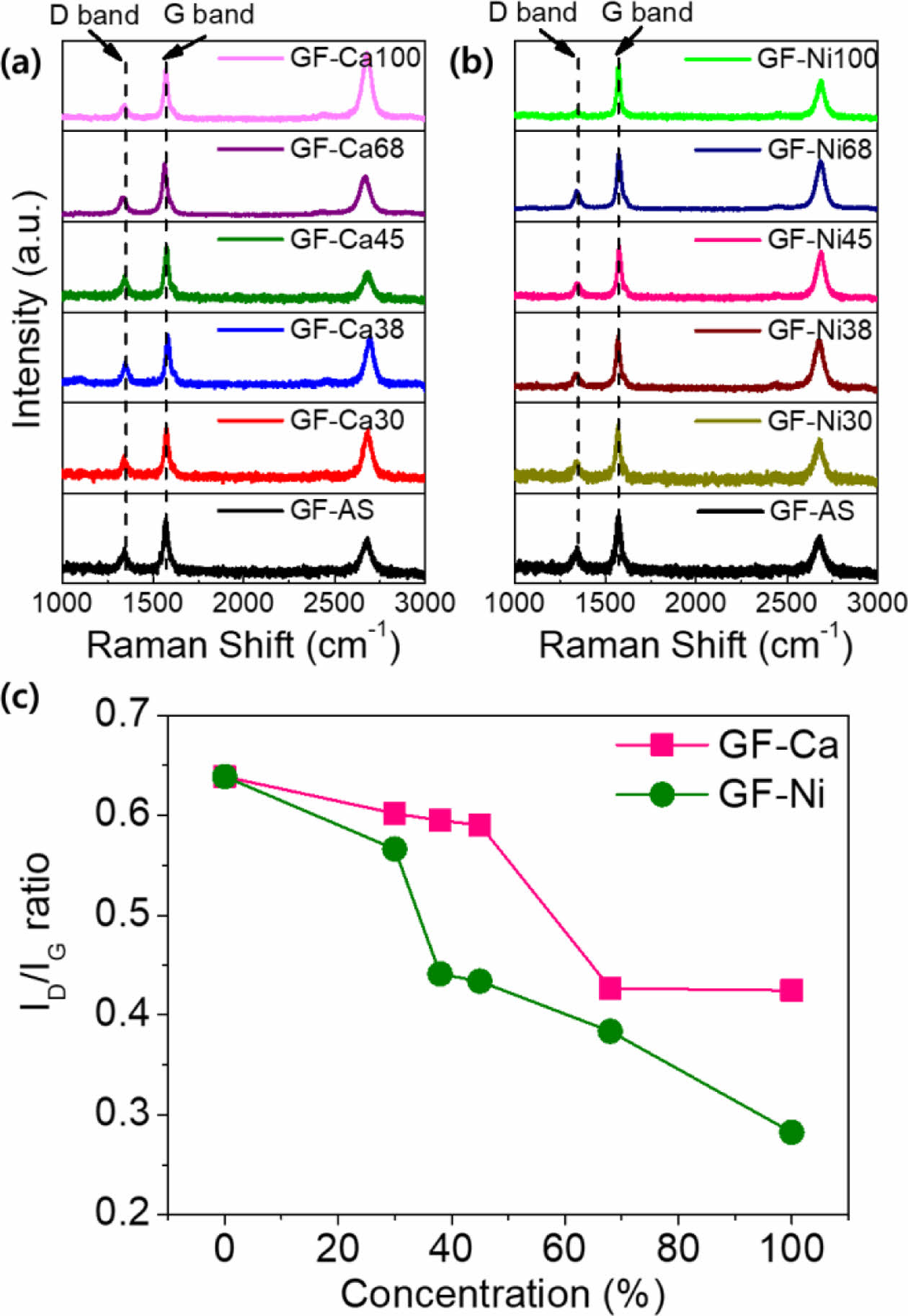Fig. 7 Raman spectra of (a) GF-As and GF-Ca series (GF-Ca30, GF-Ca38, GF-Ca45, GF-Ca68 and GF-Ca100) and (b) GF-As and GF-Ni series (GF-Ni30, GF-Ni38, GF-Ni45, GF-Ni68 and GF-Ni100) and (c) calculated ID/IG values of GF-Ca and GF-Ni series |