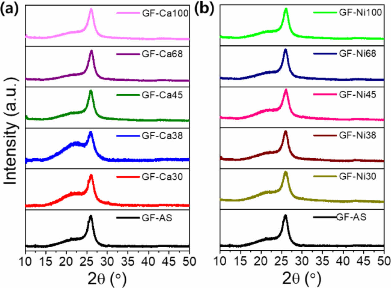 Fig. 8 XRD patterns of (a) GF-Ca series (CF-Ca30, CF-Ca38, CFCa45, CF-Ca68 and CF-Ca100) and (b) GF-Ni series (CFNi30, CF-Ni38, CF-Ni45, CF-Ni68 and CF-Ni100) |