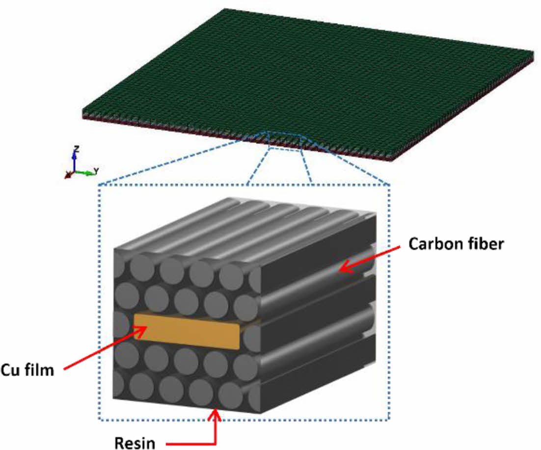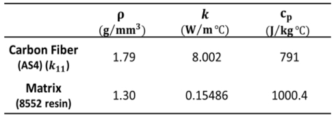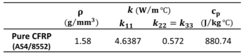 여기서 cf 와 cm은 각각 섬유와 기지의 비열을 나타낸다. 따라서 위 혼합물 법칙 수식들을 통해 도출된 pure CFRP의 열적 특성은 Table 3과 같다.