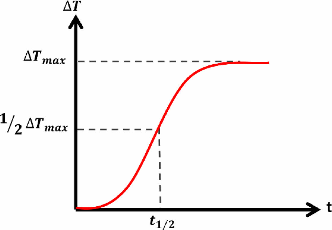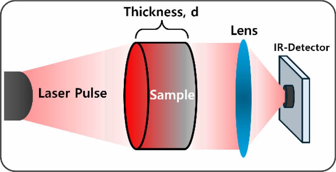 여기서 α는 열확산도, 0.1388은 heating zone과 detector의 최대 온도차의 50%(1/2∆Tmax)에 해당하는 상수, d는 시편의 두께, t1/2은 1/2∆Tmax까지의 도달 시간을 나타낸다.