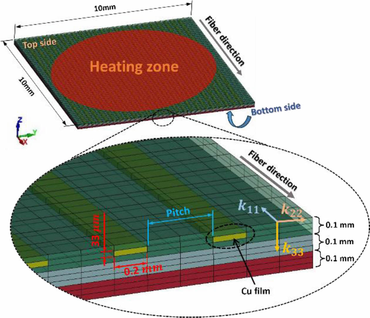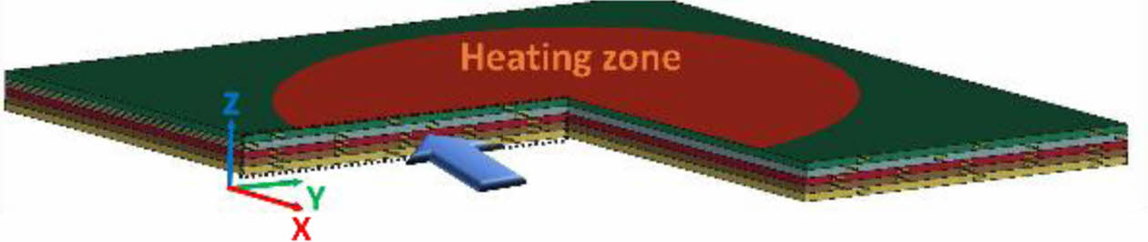 LFA를 구현한 FEA 모델은 LS-DYNA를 통해 구축되었으며 Fig. 4과 같다. 시편의 형상은 가로, 세로 10 mm의 정사각형이며 요소의 총 개수는 7,500개이다. CFRP의 각 ply 두께는 0.1 mm이고 Uni-direction(UD) type에 [0]3T의 조건으로 구현되었으며 Bottom side에서 Top side 방향으로 1,2,3순의 ply 번호가 할당되게 된다. CFRP의 열적 이방성은 In-plane에서의 열전도도인 섬유방향 k11과 섬유의 횡방향 k22 그리고 두께방향 k33으로 정의될 수 있으며, MAT-021_ ORTHOTROPIC_THERMAL을 통해 구현되었다. Cu film의 형상은 폭 0.2 mm, 두께 33 mm이며 길이는 CFRP와 동일한 10 mm이다. Cu film은 구리로 구성되어 있으므로 T01-THERMAL_ISOTROPIC을 통해 열적 등방성이 구현되었다. Cu film의 경우 배치되는 개수가 사이 간격을 나타내는 Pitch를 통해 결정되며 배치는 Fig. 4에서와 같이 ply 두께의 1/2 위치에 적용되게 된다. 또한 Cu film은 CFRP의 섬유 방향과 일치하도록 배치되게 된다. 배치되는 경우는 Table 1에서와 같이 총 4가지 type에 한해서 배치되어질 수 있다. Laser pulse에 의한 heating zone은 Top side 면적의 70%에 10 ms동안 20 mW/mm2의 heat flux가 투입되며 반대편인 Bottom side에서 Fig. 3에서와 같은 시간에 따른 온도변화 그래프가 도출되게 된다. 그 외 측면은 모두 단열로 설정되었으며 Top side와 Bottom side의 경우 대류와 복사에 의한 열전달은 고려되지 않는다.