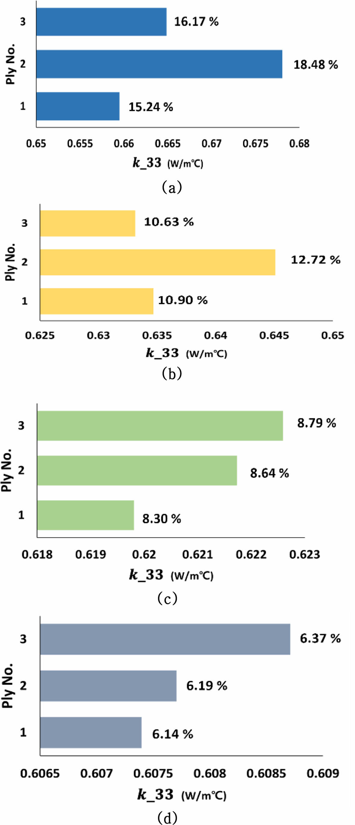 Cu film의 배치 조건과 적층 순서에 따른 k33의 증가량은 Cu film의 배치 간격이 좁을 수록 중간 ply에서 높게 나오며, 배치 간격이 넓을 수록 상부 ply에서 높게 도출되게 된다. 중간 ply의 Cu film 배치 간격이 좁은 경우 상부 ply에서 하부 ply로의 층간 열확산에 있어 효율적으로 작용될 수 있기에 k33가 높게 도출된 것으로 사료된다. 반면 Cu film 배치 간격이 넓은 경우에는 간격 사이에 열전도도가 낮은 CFRP로 인해 중간과 하부 ply에서의 열확산이 더디게 발생하게 된다. 따라서 heating zone의 열을 바로 전도할 수 있는 상부 ply에서의 k33가 높게 도출된 것으로 사료된다.