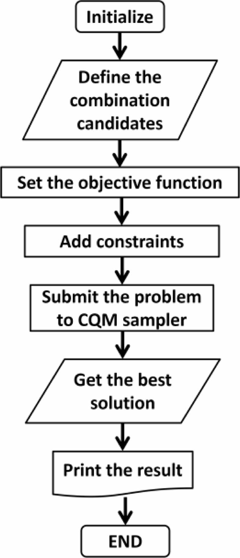정의된 조합 최적화 문제로부터 공식화된 수식은 D-Wave에서 제공하는 python 기반 SDK(software development kit)인 Ocean의 dimod API(Application Programming Interface)를 통한 프로그래밍과 D-Wave Leap 양자 클라우드 서비스를 통한 양자 컴퓨터로의 임베딩 과정이 Fig. 7의 순서로 수행되었다. 정의된 문제는 제약조건이 포함되어 있으므로 초기 Initialize에서 CQM(constrained quadratic model) 선언을 통해 D-wave에서 제공하는 CQM sampler가 적용되었다. 조합 후보의 정의는 dictionary 형태로 입력되게 되며 각각의 dictionary 요소들은 binary항으로 표현되게 된다. 따라서 식(8)의 목적함수는 binary항으로 표현된 모든 조합후보와 ki간 곱의 합으로 프로그래밍 되며, 식 (9)의 경우 목적함수와 동일하게 표현되나 배치가능한 Cu film의 최대 설정 개수 이하를 만족하도록 제약조건이 적용되게 된다. 본 연구에서는 6가지 경우(Cu film의 최대 배치 제한 개수: 24, 32, 40, 48, 56, 64)에 대해서만 수행되었다. 식 (10)의 경우는 정해진 index No.안에서 모든 binary항의 합이 1이 되도록 작성되었다. LeapHybridCQMSampler의 선언을 통해 sampler를 정의하고 작성된 목적함수와 제약조건들은 양자컴퓨터에 임베딩되어 최적화가 수행되게 되며 각 경우마다 5번씩 반복 수행되었다.
