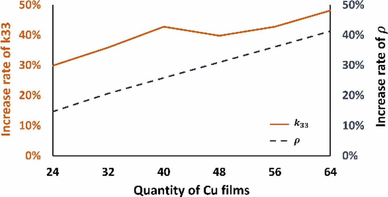 Cu film의 조합을 통해 형성된 각 배치 패턴은 두께 방향으로의 고유 열전도 경로를 나타내었다. 이러한 열전도 경로의 형성은 Cu film의 횡방향 배치 자유도에 따라 다르게 나타나며 배치 자유도가 높을 수록 더욱 개선된 k33가 도출될 수 있을 것으로 판단된다.