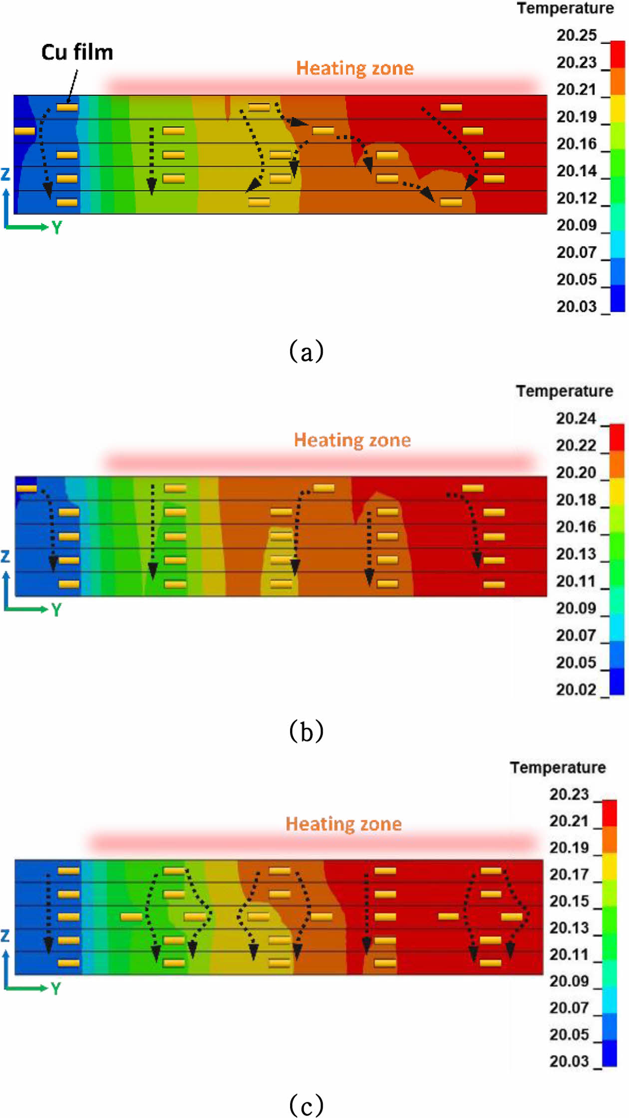 Fig. 10 Heat conductive pathway in thickness direction according to combination: (a) 40 Cu films, (b) 48 Cu films, (c) 56 Cu films |