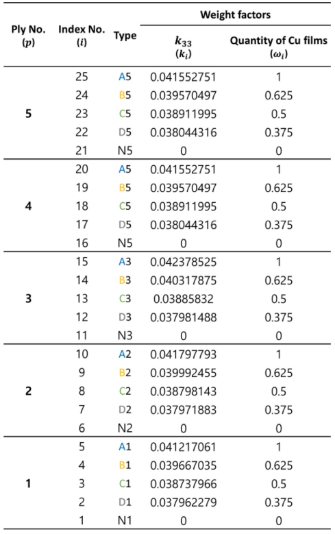 여기서 ωi는 Table 5의 정규화 된 Cu film 투입 수량을 의미하며 W는 Cu film CFRP에 투입될 수 있는 전체 Cu film의 수량을 나타낸다.