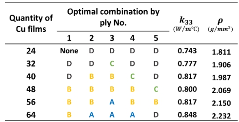 Cu film의 최대 배치 제한 개수로 선정된 6가지 경우에 대한 QA 결과를 통해 도출된 최적의 Cu film 배치 순서는 Table 6과 같이 도출되었다. 각 Quantity of Cu films는 제약조건으로 지정된 가용 배치 수량을 의미하며 도출된 최적 배치 조합은 ply 번호 순으로 나열되었다. 각 최적 조합들은 LFA 방식의 FEA를 통해 k33가 계산되었으며, 밀도(r)는 각 최적 조합이 적용된 Cu film CFRP의 전체 밀도를 나타낸다. 도출된 각각의 최적 조합을 보면 배치될 수 있는 Cu film 수량이 많아질수록 배치 간격이 조밀한 Type 위주로 조합이 형성된 것을 볼 수 있으며, 반대로 수량이 적어질수록 조합이 단조롭게 구성되는 양상을 볼 수 있다. 이는 Cu film 수량 제한이 제약조건으로써 우세하게 작용한 결과로 사료되어진다.