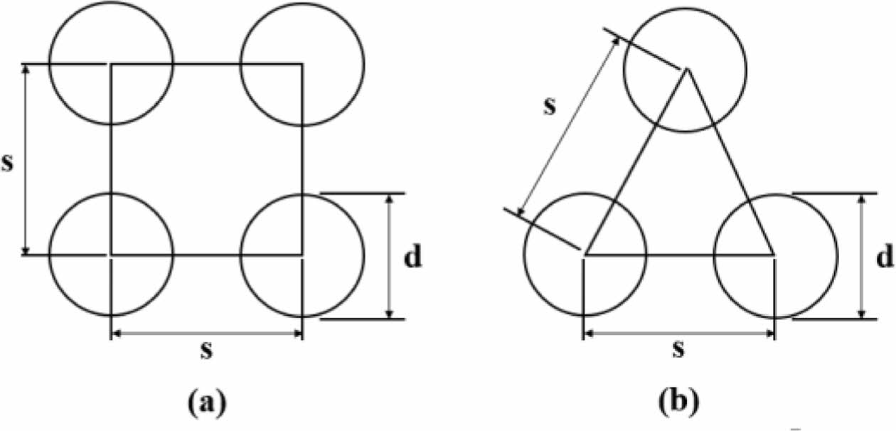 Fig. 1 Representative area elements for idealized square and triangular fiber-packing geometries, (a) square array, (b) triangle array |
