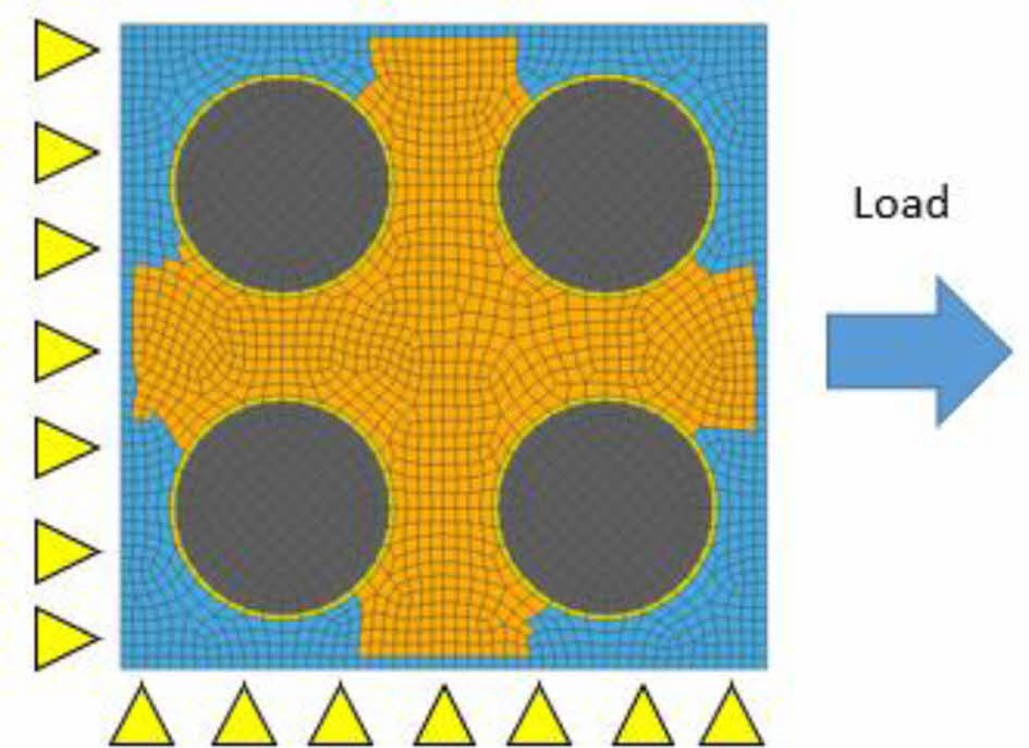멀티스케일 모델링은 구조 시뮬레이션은 탄소 섬유 강화 플라스틱(CFRP)과 같은 불균일한 재료의 해석에 일반적으로 사용되는 방법이다[17]. 미세 기계모델은 복합재의 국부적 손상과 손상의 시작 및 전파를 예측할 수 있다. 섬유 강화 복합재에 대한 미세 기계적 특성을 연구하기 위해 유한 요소 모델인 Representative Volume Element(RVE) 모델은 구성 길이 척도에서 복합재의 변형 및 손상을 시뮬레이션할 수 있는 기회를 만들었으며, mesoscopic scale에서 손상 시작 및 진화를 예측하는 데 사용할 수 있다[18-25]. 한편, RVE 모델은 거시적 규모의 기계적 특성을 분석하는 데에도 사용할 수 있다[26,27]. 특히, RVE 모델을 이용한 유한 요소 분석은 구조 구성 요소의 구조적 신뢰성을 평가하는 데 필요한 주요 통계를 제공할 수 있다. Hyde et al.[28]은 미세 구조 모델에 포함된 섬유 간 및 매트릭스 공극의 형상이 복합재의 강도에 미치는 영향을 연구했다. 시뮬레이션 결과에 따르면 균열은 섬유 간 공극에서 시작되며 전파 경로는 매트릭스 공극의 영향을 크게 받는다. 또한 실험 및 이론 연구에 따르면 공극은 복합재의 횡방향 인장 및 압축 강도를 감소시키고, 신뢰성을 더욱 감소시킬 수 있다[29,30]. 공극 모양, 크기, 방향 또는 밀도가 변할 때 다양한 하중 모드에서 공극이 복합재의 강도에 얼마나 많은 영향을 미치는지에 대한 더 많은 연구가 필요하다.
