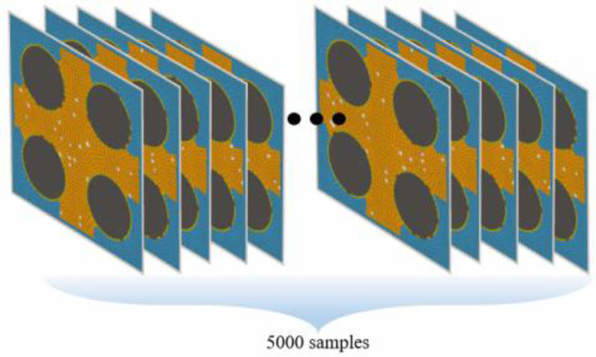 초기 공극 결함은 전체 matrix 요소의 1%를 제거하여 생성되었다. 모집단의 크기를 고려하여 표본오차 1.5%, 신뢰수준 95%를 기준으로 계산된 적정 표본의 수보다 많은 5000개로 단순 무작위 표본추출 방법을 이용 초기 공극 결함이 있는 RVE 모델 표본 집단이 구성되었다.
