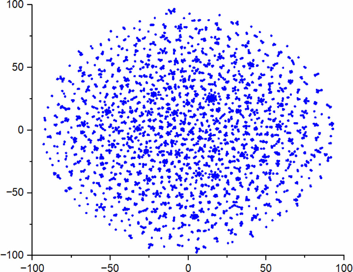 Fig. 3과 같이 공극 결함의 위치가 다양하게 분포된 5000개의 초기 공극 결함이 있는 표본 데이터는 두 가지의 이유로 유사도 분석이 필요하다. 첫 번째 단순 무작위 추출을 통해 구축된 표본 데이터들의 유사도가 높을 경우 모집단을 대표하지 못하고 편향된 결과를 보일 수 있기 때문이다. 유사도 분석이 필요한 두 번째 이유는 유사도 분석이 진행된 데이터들을 이용해 군집화를 진행하여 공극 결함의 위치 영향을 분석할 수 있기 때문이다. 따라서, 앞서 설명된 t-SNE 기법을 이용해 표본 데이터들의 차원이 축소되고 유사도 분석이 진행되었다. Fig. 3과 같이 5000개의 RVE 모델을 각각 이미지 데이터로 만들어 t-SNE 기법을 이용한 차원 축소가 진행되었다. Fig. 4는 t-SNE 기법을 이용해 차원 축소된 데이터가 가시화된 것이다. 각 점은 RVE 모델을 의미하는데 동일한 RVE 모델에서 무작위로 공극의 위치만 변경된 고차원 이미지 데이터들에 차원 축소가 진행되어 하나의 군집처럼 나타난 것을 확인 할 수 있다. Fig. 4를 보면 여러 군집으로 분포되지 않고 하나의 원형 군집으로 나타난 것을 확인 할 수 있는데 이는 무작위로 생성된 데이터이기 때문에 고차원 이미지 데이터들부터 군집을 형성하고 있지 않아서 저차원으로 차원이 축소되어도 하나의 군집으로 나타나는 것을 확인할 수 있다. 또한, 데이터들의 밀도가 특정 위치에 높게 나타나지 않고 균일하게 나타난 것으로 보아 편향되지 않은 표본 집단인 것이 확인할 수 있다. 다음으로는 군집 분석을 통해서 일부 밀도가 높은 영역을 분석이 진행되었다.