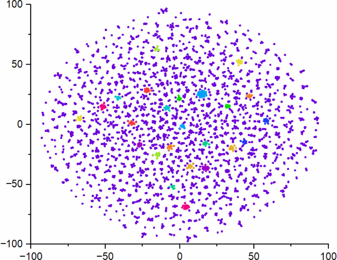 군집 분석은 각 데이터의 유사성을 측정하여 다수의 군집으로 나누고 군집 간의 상이성을 확인하는 분석이다. 이번 연구에서는 Fig. 4와 같이 t-SNE 기법을 이용해 차원 축소된 결과에서 다소 밀집된 부분의 데이터들의 유사성을 확인하기 위해서 밀도 기반 군집 분석인(Density-Based Spatial Clustering of Applications with Noise, DBSCAN)이 진행되었다. DBSCAN은 대표적인 밀도 기반 군집화 알고리즘으로 작업자가 선정할 수 있는 두 가지의 hyperparameter가 있다. 첫 번째 hyperparameter는 Epsilon으로 군집을 형성할 최소 거리를 정의해 주는 것이고 두 번째 hyperparameter인 Min points는 군집 시 최소한의 데이터 포인트의 수를 정의해주는 것이다. 다시 말해 한 점을 기준으로 Epsilon 거리만큼 떨어진 점들이 Min points 만큼 모여 있으면 하나의 군집으로 선정되는 알고리즘이다. 본 연구에서는 t-SNE 좌표계에서 Epsilon은 2, Min points를 12로 하여 2의 거리내에 12개의 데이터가 모여있는 군집을 형성하여 분석되었다. 데이터들이 군집된 결과는 Fig. 5에 나타나 있다. 입력된 hyperparameter에 따라 형성된 군집의 수는 총 23개이고 이들의 유사성은 공극의 위치가 유사한 지점이 최대 3곳이 있는 것으로 확인되었다. 소수의 공극 위치가 유사하게 나타나서 이를 이용해 횡방향 인장강도의 유사성은 찾을 수 없었다.