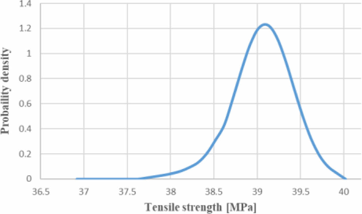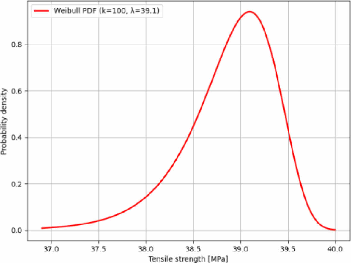 Fig. 5은 이전 절들을 통해 검증된 표본집단 5000개의 RVE모델들의 횡하중 강도를 확률 밀도함수로 나타낸 것이다. 표본집단의 평균 강도는 39.1 MPa, 최대 강도는 39.8 MPa, 최소 강도는 36.9 MPa로 나타났다. 이를 통해 공극 결함의 위치에 따른 복합재의 횡하중 강도 변화가 확률 밀도 그래프로 표현되었다. 검증된 표본 분석을 통해 나온 확률밀도를 유연하게 다양한 확률 분포를 나타낼 수 있는 Weibull 분포로 표현될 수 있다. 식 (7)은 Weibull 분포를 나타내는 수식으로 평균을 뜻하는 λ = 39.1, 형상 변수 k = 100을 대입하여 2.2절에서 설정된 표본오차 1.5%를 고려한 확률밀도 함수를 Fig. 6과 같이 나타낼 수 있다. 이를 이용해 macro scale 해석 모델의 물성에 적용하여 복합재 구조의 횡하중 강도에 대한 신뢰성 해석에 활용될 수 있을 것으로 사료된다. Fig. 7