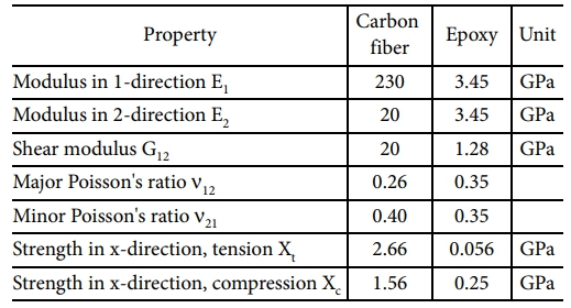 복합재료 이론에서 Representative Volume Element(RVE) 모델은 거시적인 모델의 기계적인 특성 값을 측정할 수 있는 가장 작은 부피 요소를 의미한다[31]. 단방향 섬유강화 복합재의 RVE 모델은 Fig. 1과 같이 정사각형으로 정렬된 모델과 삼각형 구조로 정렬된 모델로 사용되는 주기적 미세 구조가 있다. 본 연구에서 사용된 모델은 Fig. 1의 (a)와 같이 정사각형으로 정렬된 모델이 사용되었고 식 (1)과 같이 섬유 중심 간격(s)와 섬유의 직경(d)를 조절해 섬유부피 비율이 계산되어 Vf = 0.36으로 설계되었다[32]. RVE 모델의 섬유는 탄소 섬유, 수지는 에폭시로 선정되었고 재료의 물성은 Table 1에 나타나 있으며 실험을 통해 검증된 물성을 적용하여 진행되었다[33,34]. Fig. 2와 같이 정사각형으로 정렬된 모델로 구축된 RVE 모델 횡방향 인장이 작용할 때 경계조건이 적용되었다.