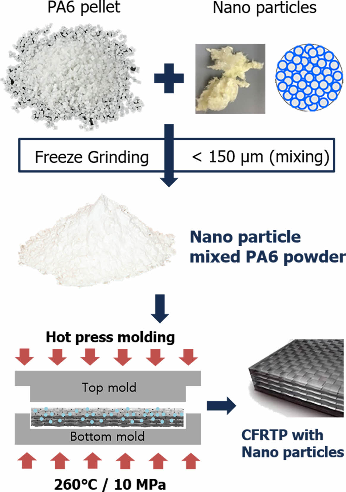 CFRTP는 260oC, 20 MPa에서 핫프레스를 이용하여 압축 성형 공정으로 제작하였다. 동결분쇄를 통해 분쇄 및 나노필러가 혼합된 PA6 파우더를 탄소섬유 직물에 도포하였다. 이때 균일한 함침을 위해서 필요량 2배 이상의 수지를 도포하였다. 제작된 시편의 크기는 120 mm × 120 mm였으며, 인장 시험(0.75 mm, CF 3 plies), Izod 충격 시험 및 Short beam 전단 시험(3 mm, CF 12 plies)을 위해 두 가지 다른 두께로 제조되었다.