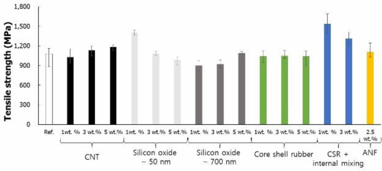 Fig. 2는 CFRTP의 PA6 기지재에 혼합된 나노필러의 종류 및 혼합 비율에 따른 인장강도 측정 결과이다. 나노필러가 혼합되지 않은 PA6 기반 CFRTP의 인장강도는 1100 MPa이었으며, 50 nm silicon oxide를 1 wt.% 혼합하였을 때, 1400 MPa로 증가하였다. 응집도가 높은 Core shell rubber는 단순 혼합을 통해서는 아무런 효과를 보이지 않았으나, Internal mixer로 1 wt.% 혼합하였을 때 40% 증가한 1530 MPa로 최적 결과를 가졌다. 이외의 경우에는 오차범위 내 차이 혹은 오히려 감소하는 경향을 보였다.