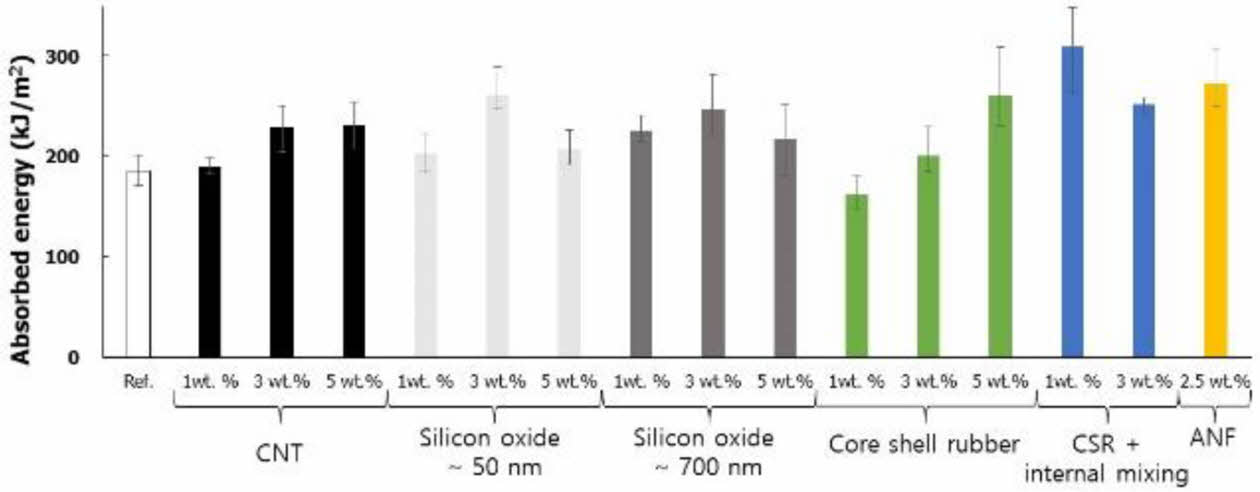 Fig. 3은 CFRTP의 PA6 기지재에 혼합된 나노필러의 종류 및 혼합 비율에 따른 Izod 충격 강도 측정 결과이다. 인장강도 결과와 달리 나노필러의 혼합 비율 및 종류에 무관하게 모두 증가하는 추세를 보였다. 나노필러가 혼합되지 않은 CFRTP가 186 kJ/m2의 충격강도를 가진 반면 Core shell rubber를 internal mixing을 통해 1 wt.% 혼합하였을 때, 67% 증가하여 충격강도는 310 kJ/m2로 67% 증가하였다. ANF 역시 50% 이상의 높은 충격 강도 향상을 보여주었으며, MWCNT와 silicon oxide는 20% 수준의 증가율을 보여주었다.