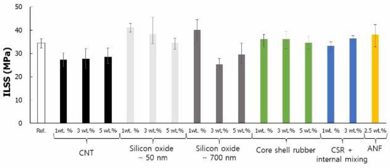 Fig. 4은 CFRTP의 PA6 기지재에 혼합된 나노필러의 종류 및 혼합 비율에 따른 층간전단강도 측정 결과이다. 나노필러 혼합에 따른 층간전단강도 시험 결과는 인장강도와 충격강도와 전혀 다른 경향성을 보였다. MWCNT를 혼합한 경우 ILSS 각 20% 이상 크게 감소하였으며, Core shell rubber, ANF 모두 혼합 방법, 비율과 무관하게 ILSS에 차이가 없었다. Silicon oxide를 1 wt.% 혼합한 경우에만 20% 증가하는 경과를 보여주었으며, 이 역시 혼합 비율이 높아지면 ILSS가 크게 감소하였다.