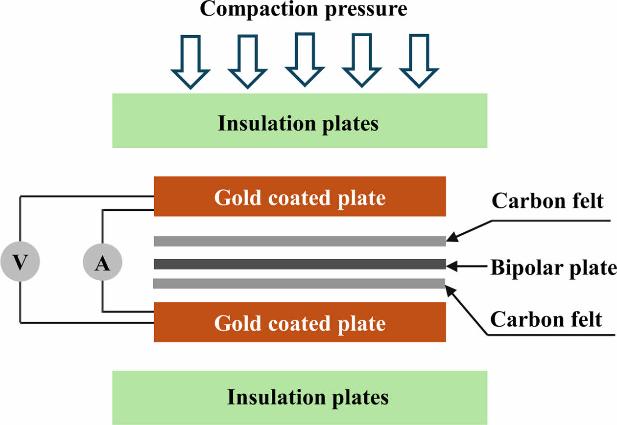 대안으로 국부 열가소성 용접을 활용해 제작한 VRFB용 탄소 펠트 전극 일체형 분리판 구조가 개발되었으며 ICR의 감소로 인해 스택 저항이 감소하고 에너지 효율이 높아지는 것으로 나타났다[16]. 그러나 탄소 펠트 전극의 상대적으로 낮은 기계물성에 의해 제조 과정에서 가해지는 압축 압력으로 인한 기공률 감소 및 섬유 파손이 일어날 수 있다[23]. 또한, 이러한 통합 방법은 전도성 수지층과 구성 요소 사이에 새로운 계면을 형성할 수 있어 추가적인 제약이 있을 수 있다. 단일 탄소 펠트에서 파생된 탄소 펠트 전극과 분리판 어셈블리로 구성된 통합 구조 또한 개발되었다. 그라파이트 펠트 한 장으로 일체형 구조를 제작해 접촉저항을 낮추었으며 기공률 감소를 글루코스 부분 함침으로 해결하였다[24]. 그러나 이 연구는 단면 탄소 펠트 전극-분리판 어셈블리에만 적용이 가능하였으며 낮은 글루코스 압축 강도로 인해 분리판 제작 시 충분한 압축 압력을 인가하기 어렵다는 분제가 있다. 또한 인접한 셀 간에 ICR이 존재하여 다중 셀 스택을 갖춘 VRFB의 상용화에 걸림돌이 된다.