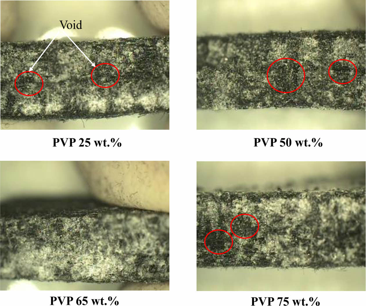 탄소 펠트에 PVP를 함침시키기 위하여 PVP의 희석 농도를 다르게 하여 최적화하였다. Fig. 5와 같이 65 wt.%의 PVP경우 탄소 펠트가 균일하게 함침되는 것을 확인할 수 있었다. 그러나 25 wt.%와 50 wt.% 그리고 75 wt.%로 물과 희석된 PVP의 경우 함침 시 공극이 발생하였다. 25 wt.%와 50 wt.% 시편의 경우 희석된 PVP 수지의 점도가 낮아 탄소 펠트의 함침 후 경화 과정에서 함침 된 수지가 흘러나와 공극을 생성하였다. 반면 75 wt.%의 PVP 수지를 사용한 경우 높은 점도로 인하여 탄소 펠트가 충분히 함침되지 못하고 내부에 공극이 발생하였다.