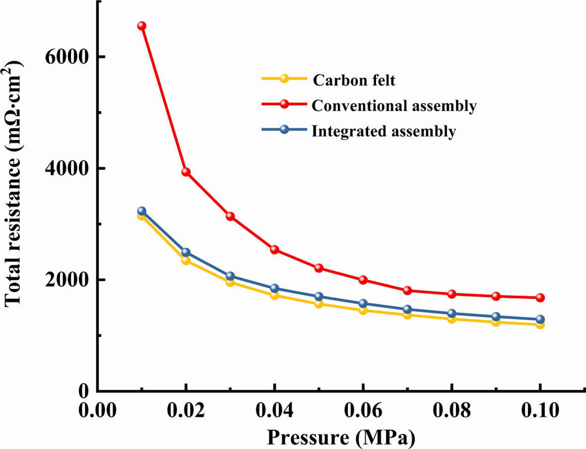 Fig. 7 Total resistance of the carbon felt, conventional structure and integrated assembly |