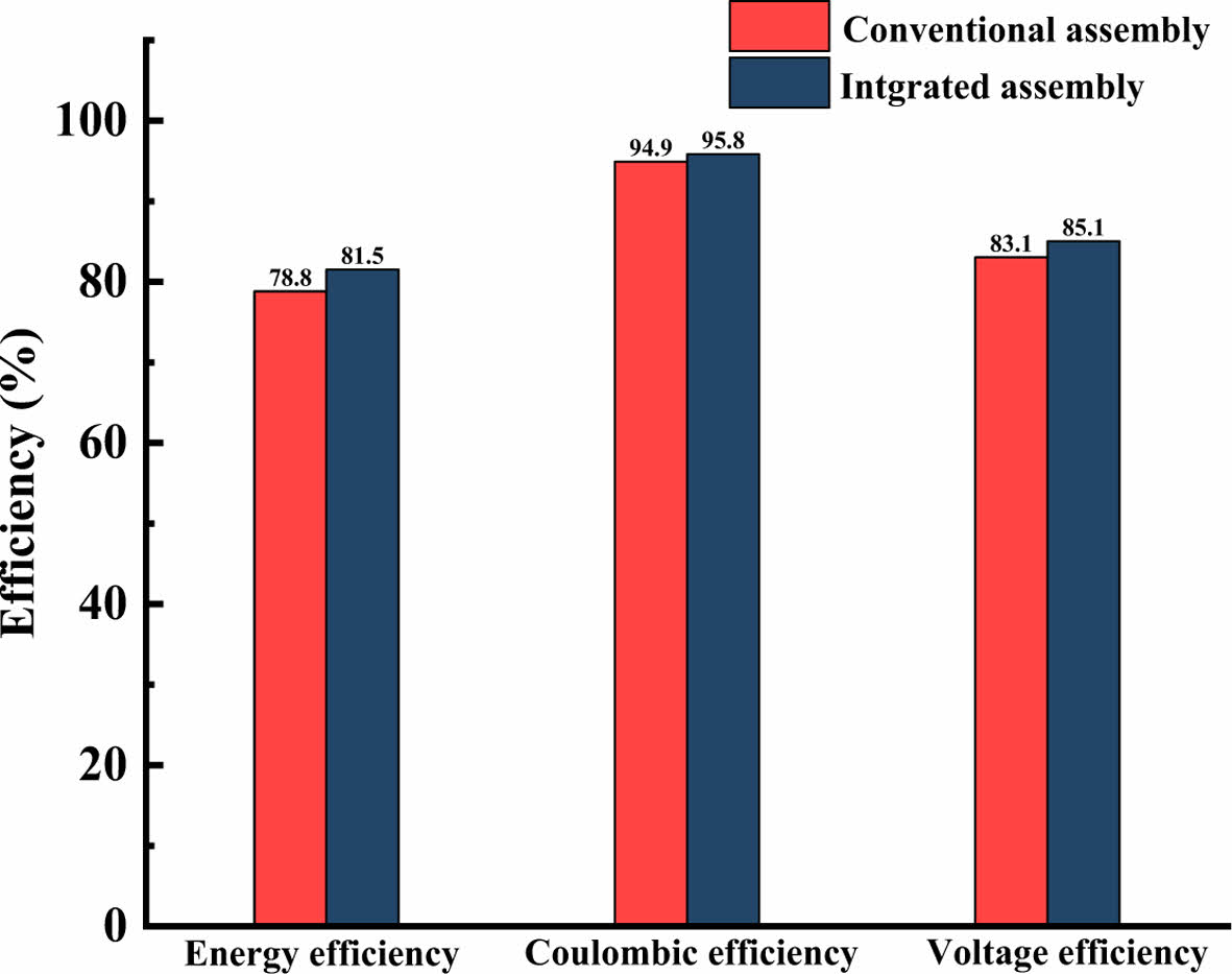 Fig. 8에서 볼 수 있듯이 일체형 구조의 정전류 충/방전 테스트 결과 방전 전압은 감소하고 충전 전압은 증가한 것으로 나타났다. 개발된 전극-분리판 일체형 조립체의 단일 셀 충/방전 테스트에서 81.5%의 에너지 효율을 달성하였으며, Fig. 9와 같이 기존 전극 분리판 구조의 78.8%보다 3.2% 향상된 성능이다. 이는 기존 전극 분리판 구조에 비해 낮은 셀 저항으로 저항 손실이 감소한 결과로 판단된다.
