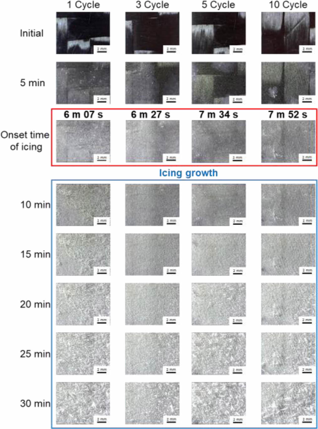 Fig. 2 Photos of onset of icing and icing growth on topcoat surface during de-icing cycle |