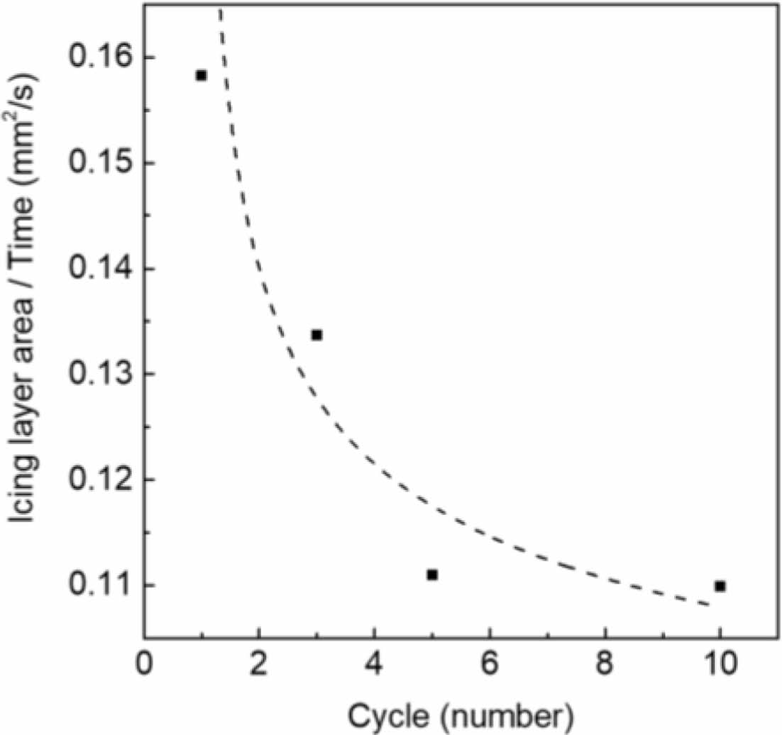 Fig. 3은 제빙 횟수에 따른 결빙 생성 속도를 나타낸 그래프이다. 초기 시편의 결빙 형성 속도는 0.15 mm2/s이고, 측정된 시편 중 결빙속도가 가장 빠른 것으로 확인되었다. 제/방빙액을 활용하여 반복적인 제빙을 수행함에 따라, 표면의 결빙 성장 속도는 점진적으로 감소하는 추세를 보였다. 표면에 손상이 생기게 되며 표면에 결빙핵 생성이 어려워지며 결빙 생성 속도가 감소한 것으로 예상된다. 5회 이상 처리한 경우 약 0.11 mm²/s에서 수렴하는 경향을 보였다.