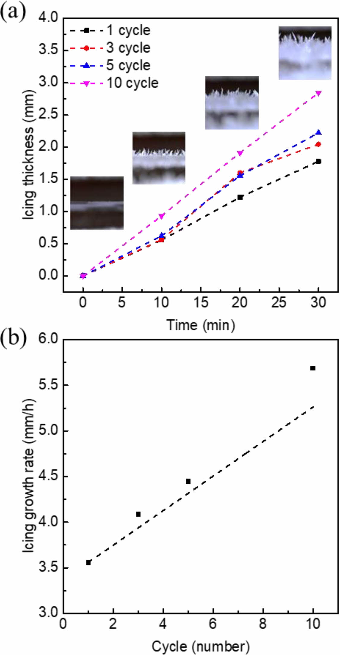 Fig. 4 (a) Variation in icing thickness over time and (b) icing growth rate depends on de-icing cycle |