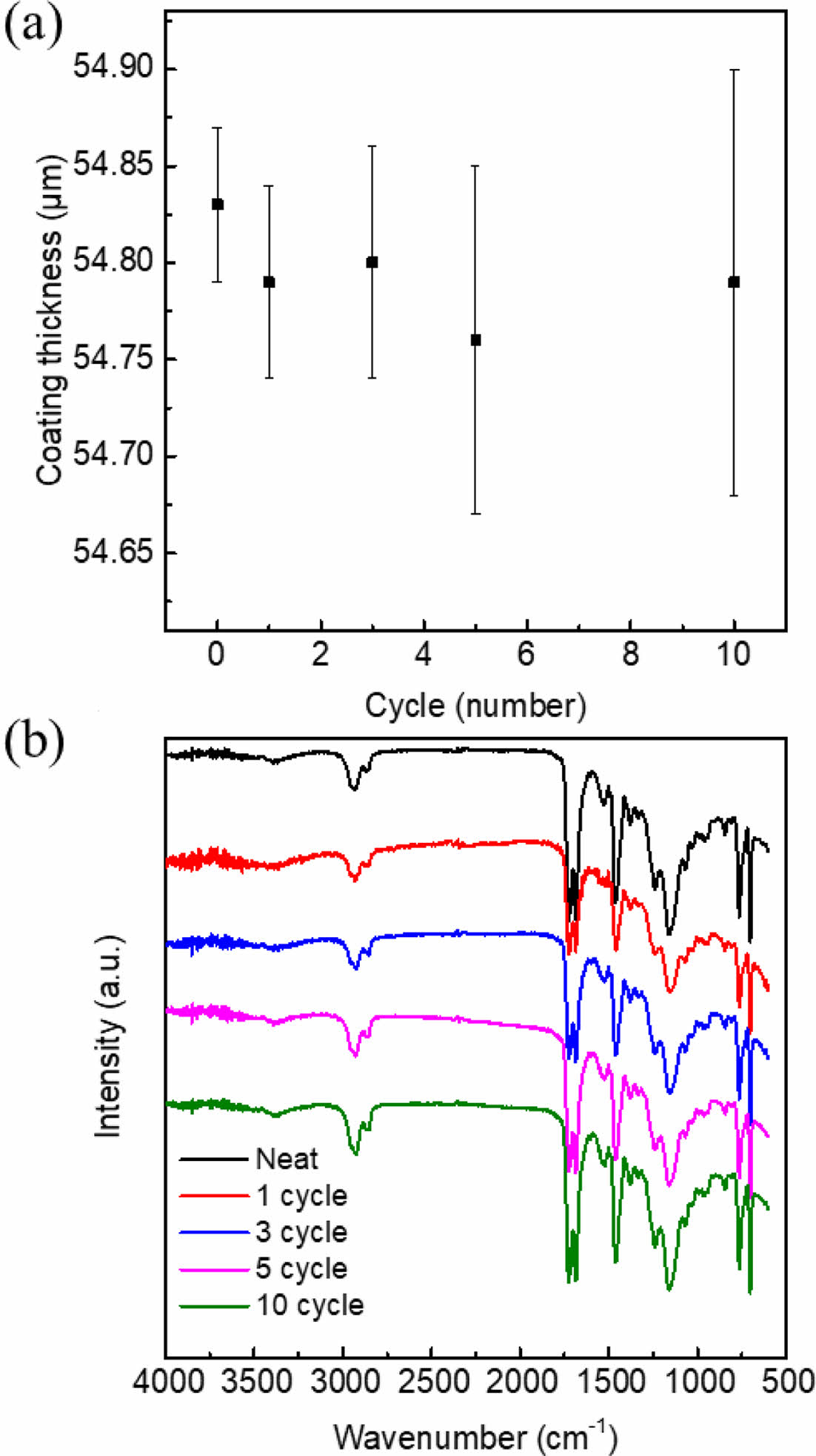 Fig. 5 Alteration of (a) coating thickness and (b) FT-IR depend on de-icing cycle |