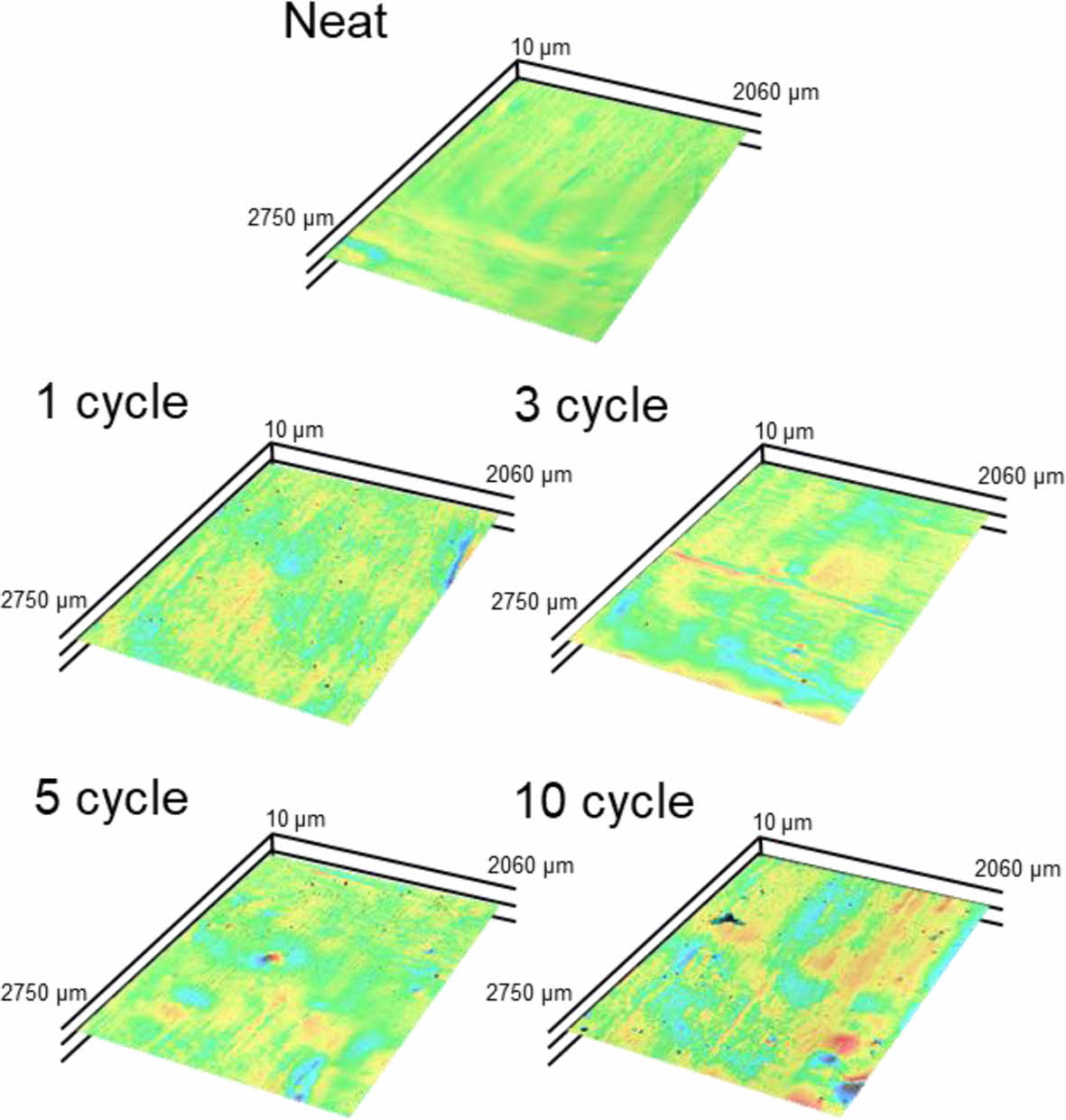 Fig. 6은 공초점 현미경을 통하여 확인한 3차원 표면이미지이다. 제/방빙액 처리가 진행됨에 따라 탑코트에 손상이 발생하는 것을 확인할 수 있다. 이미지에서 확인할 수 있는 것처럼 탑코트 표면에 갈라짐이나 벗겨짐과 같은 손상이 발생된 것을 확인할 수 있다. 이러한 손상의 원인은 FT-IR에서 확인하였던 것처럼 화학적 변화에 의한 손상이 아니라 제/방빙액의 분사 시 가압에 의한 물리적 영향과 저온에서의 제/방빙액을 분사할 때 발생하는 압력은 표면에 직접적인 물리적인 충격을 추며, 탑코트에 균열과 같은 손상을 일으킨다.
