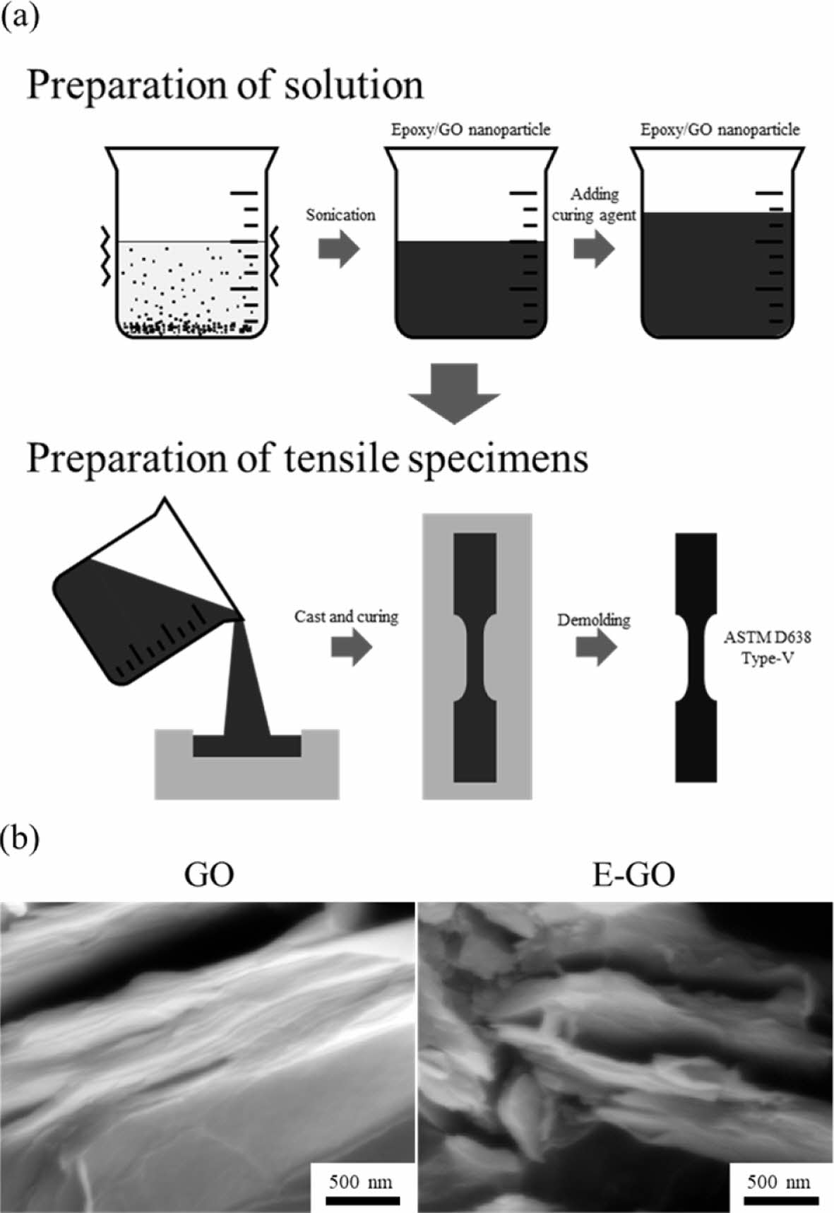인장 시험용 시편을 제작하기 위하여 초음파 분산을 통하여 에폭시 수지에 분산시킨 후 경화시켜 제작하였다(Fig. 1a). Bath형 초음파 분산기(275DAE, Crest ultrasonic, 말레이시아)를 사용하여 에폭시 수지에 나노입자(GO, E-GO)를 45 kHz로 6분동안 분산시켰다. 나노입자의 함량은 각각 0.1, 0.3, 0.5 및 1 wt%로 첨가하였다. 나노입자를 분산시킨 에폭시 수지에 경화제를 에폭시 10: 경화제 3의 비율로 섞어 용액을 제작하였다. 제작된 용액을 ASTM D-638 type V로 제작된 실리콘 몰드에 캐스팅하였고, 10분동안 탈포 작업을 진행하였다. 이후 오븐에서 80°C에서 2시간동안 경화시킨 후 상온에서 30분동안 안정화 작업을 거쳐 제작하였다.