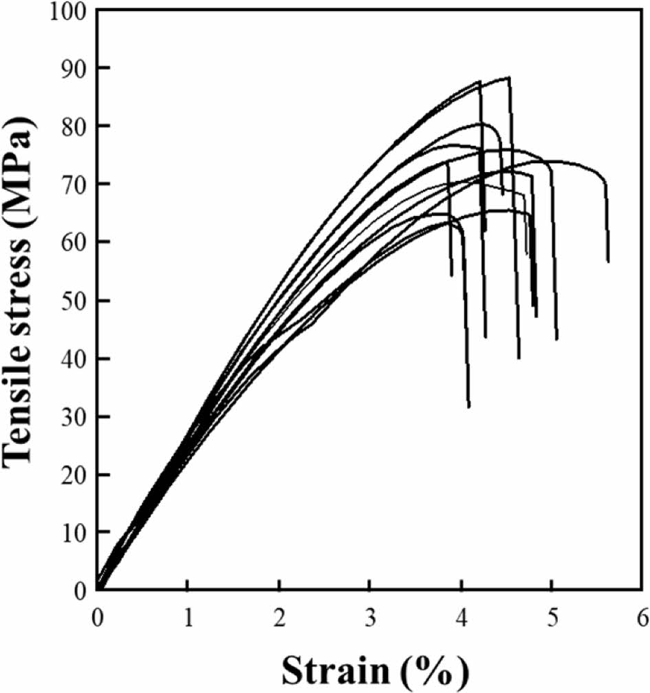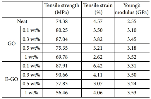 나노 입자를 첨가하지 않은 에폭시의 인장 시험을 진행하였을 때 Fig. 2의 결과를 얻었다. 나노 입자를 첨가하지 않은 에폭시의 인장 강도는 74.4 MPa로 측정되었다. Fig. 3과 Fig. 4는 각각 GO와 E-GO를 첨가하였을 때의 인장강도 시험 결과이다. GO/E-GO의 함량이 0.3 wt%일 때 가장 높은 인장 강도 결과를 얻었다. GO를 첨가하였을 때 인장강도는 87.0 MPa이고, E-GO를 첨가하였을 때 인장강도는 90.7 MPa로 가장 높은 경과를 얻었다. 나노 입자의 첨가에 따라 인장 강도가 상승하는 경향을 보였으나 0.3 wt% 이상의 함량을 첨가한 시편의 인장 강도는 저하되었다. 이는 나노 입자의 응집에 의한 결과로 예상된다. 나노 입자의 첨가에 따라 파괴 인성이 증가하는 경향을 보였다. 인장 강도나 파괴 인성의 증가는 E-GO에서 극대화되었다. 측면 부분에만 표면 처리가 일어나 수지에서 분산도의 증가 효과와 그에 따른 수지의 함침이 용이해지는 영향으로 보인다[16,17].