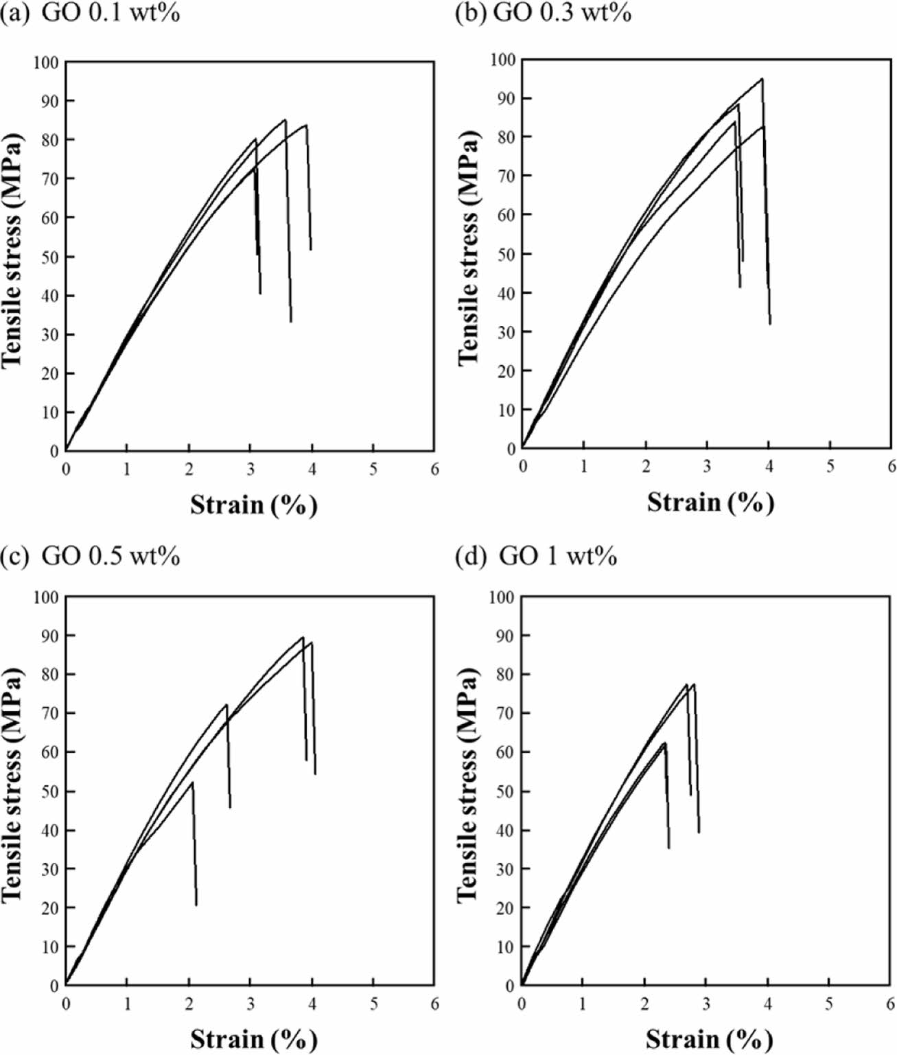 Fig. 3 Stress-strain curve according to the tensile test of nanocomposites GO (a) 0.1 wt%, (b) 0.3 wt%, (c) 0.5 wt%, and (d) 1 wt% |