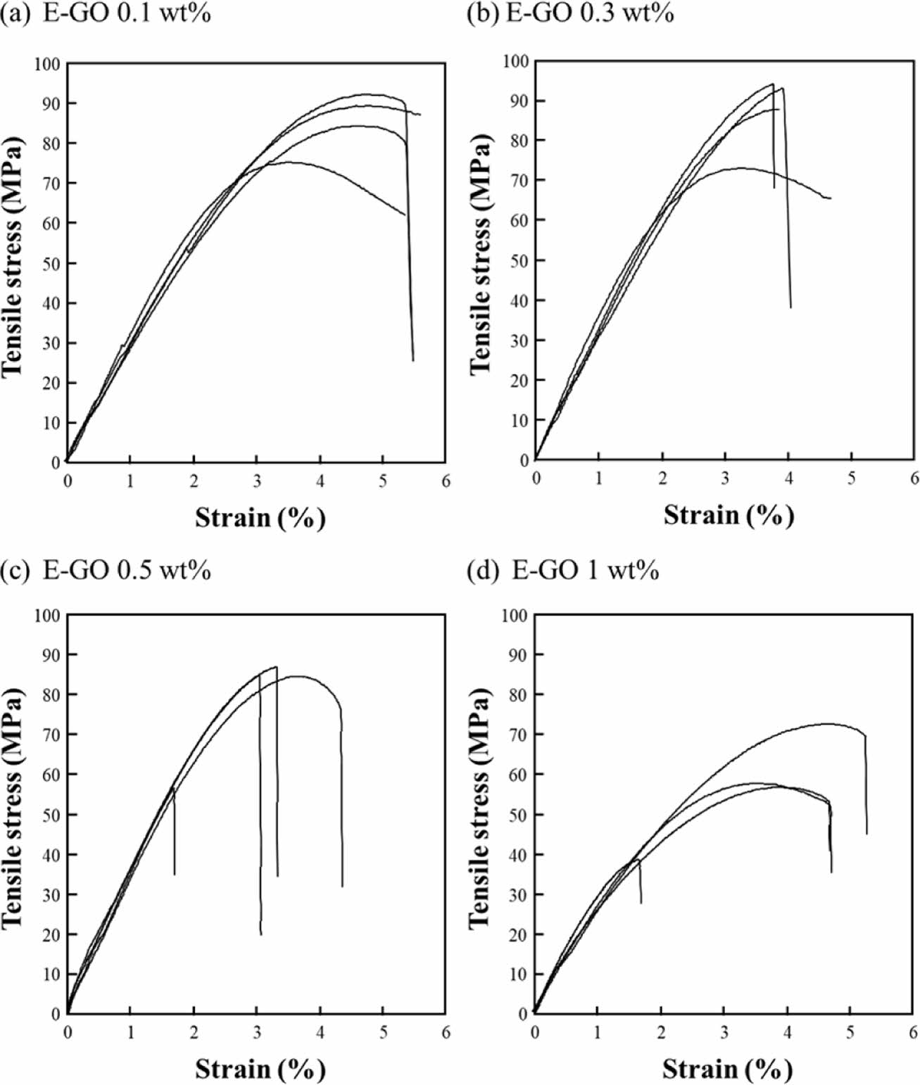Fig. 4 Stress-strain curve according to the tensile test of nanocomposites E-GO (a) 0.1 wt%, (b) 0.3 wt%, (c) 0.5 wt%, and (d) 1 wt% |