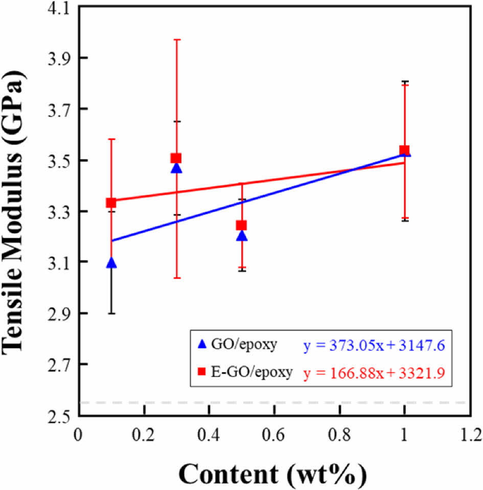 나노 입자의 첨가에 따라 모듈러스가 증가하는 경향을 보였다(Fig. 5). GO와 같은 나노 입자는 공유결합에 의하여 탄소 간의 결합을 지니고 있어 모듈러스가 고분자 재료보다 높다. 이런 나노입자가 첨가됨에 따라 에폭시가 연신이 되기 어려워지기 때문에 모듈러스가 증가하는 경향을 보였다. 나노 입자를 첨가하지 않은 에폭시의 모듈러스는 2.55 GPa로 측정되었고, E-GO를 1 wt% 첨가한 시편은 3.53 GPa로 측정되었다. 나노 입자가 첨가됨에 따라 모듈러스가 증가하는 경향을 보였고, 표면처리 된 시편에서 더 높은 값을 보였다.