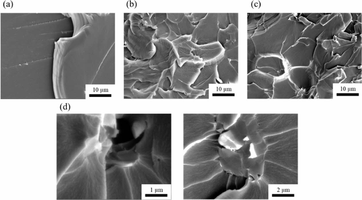 Fig. 6 Fracture surface SEM images of (a) Neat epoxy, (b) GO (0.3 wt%) nanocomposite, (c) SEO-GO (0.3 wt%) nanocomposite and (d) graphene embedded in epoxy |