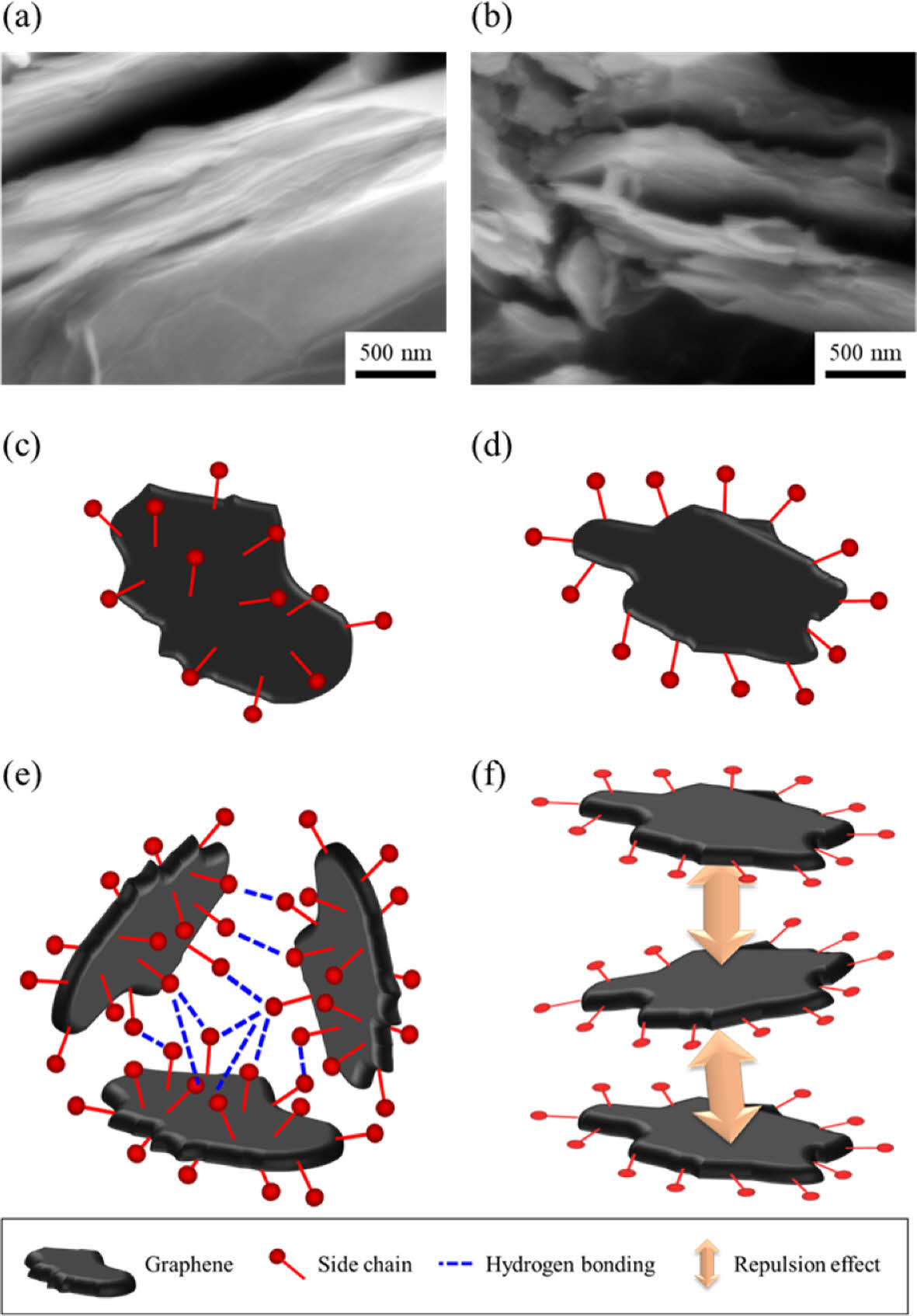 Fig. 7 SEM images of (a) GO, (b) E-GO, schematic diagram of (c) GO particle, (d) E-GO particle, (e) aggregation of GO and (f) repulsion of E-GO |