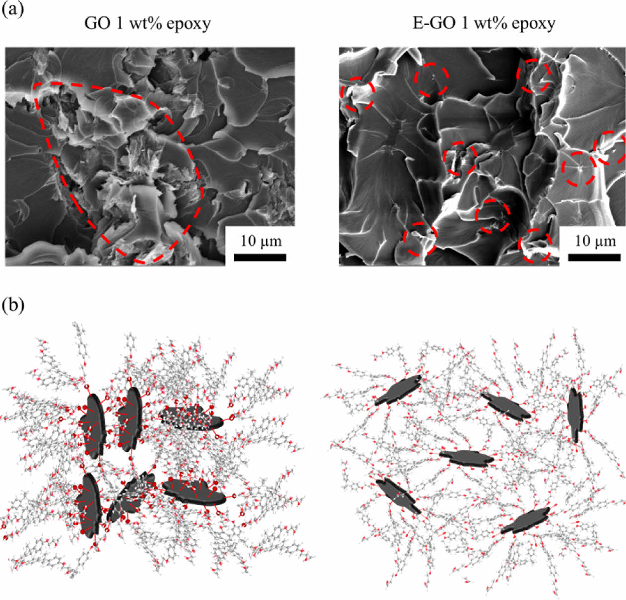 GO가 에폭시에 첨가될 경우 GO의 수산화기를 GO가 분산되게 된다. Fig. 8a에서 확인할 수 있듯이 GO의 경우 파단면에서 나노입자가 응집되어 있는 것을 확인할 수 있다. 그러나 E-GO의 경우 파단면에서 응집되어 있는 부분이 관찰되지 않았고, 나노입자에 의한 균열의 확장이 균일하게 퍼져 있는 것을 확인할 수 있었다. Fig. 8b에서 나타낸 것과 같이 GO에서는 나노입자가 응집되어 있고, 응집 부분에서 균열의 확장이 생성되지만, E-GO에서는 나노입자가 균질하게 분산되어 있어 파단면에서 균열의 확장이 증가하는 것으로 예상된다. Table 1