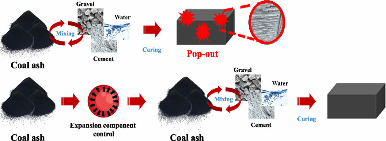 팝아웃 현상의 해결 방안으로 제안된 고온 건조처리나 입자 크기 제어의 경우 처리를 위한 비용이 크다는 한계점이 있으며, 자연 에이징 처리의 경우 에이징 처리 시간이 매우 오래 걸린다는 한계가 존재한다. 본 연구에서는 석탄재의 비용, 시간 및 처리량 효율적인 재활용 방안을 제안하는 것을 목표로 하였다. Fig. 1과 같이, 석탄재를 분석하여 CaO가 주요한 팽창성분임을 확인하였고, CaO의 반응에 대해 분석하였으며, CaO의 수화반응을 조절하여 콘크리트 제작 시 팝아웃 현상을 억제하는 방안에 대해 연구했다. 또한, 본 연구에서 제안한 수처리 방법을 통해 콘크리트 팝아웃 문제를 효율적으로 해결하고 기계적 강도를 향상시켰다.