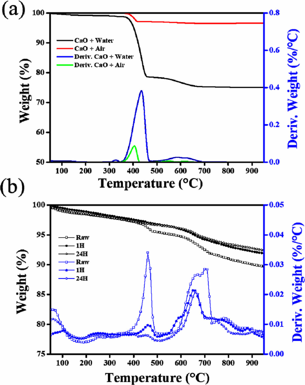 위와 같은 반응을 확인하기 위해 50 ml 매스실린더에서 CaO와 물의 반응 실험을 진행했고, CaO의 부피 및 온도변화를 측정했다. CaO와 물의 반응을 통한 부피 변화를 실린더 눈금으로 측정했으며, 그 과정에서 일어나는 발열반응을 확인하기 위해서 적외선 온도계(DT8380, Washranp, 중국)를 통해 최고 온도를 확인했다. 해당 실험은 반응 후 건조시킨 시료에 반복적으로 실험하여 부피 팽창이 확인되지 않을 때까지 진행했다. CaO와 물의 반응으로 팽창한 물질의 Thermogravimetric Analysis (TGA) 분석을 통해 생성된 물질의 피크를 관찰했다. 또한, 석탄재의 수처리 시간에 따른 반응의 변화를 확인하기 위해 TGA 분석을 진행했다.