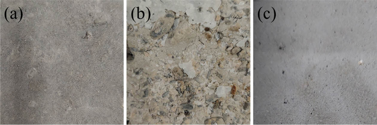 Fig. 6 Morphology of (a) sand, (b) untreated coal ash and (c) water-treated coal ash concretes |