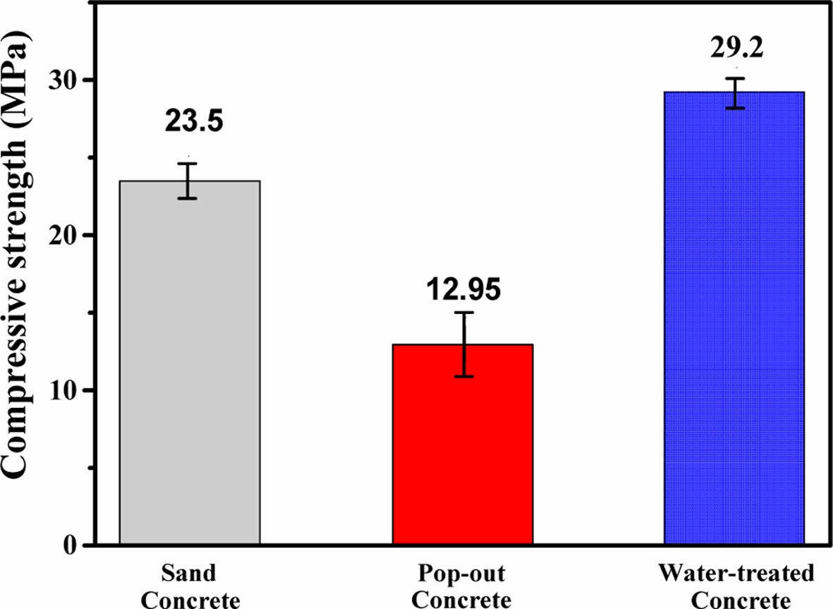 Fig. 7은 제작한 콘크리트의 압축강도를 나타낸다. 모래를 사용하여 제작한 콘크리트는 23.5 MPa의 값을 나타냈다. 반면에 팝아웃이 일어난 콘크리트의 압축강도는 12.95 MPa로 매우 낮은 값을 나타냈다. 수처리를 진행한 콘크리트의 압축강도는 29.2 MPa의 값을 나타내며, 압축강도가 상승한 것을 확인했다. 수처리 하지 않은 콘크리트 대비 수처리한 콘크리트의 압축강도는 125 % 향상되었고, 이는 수처리에 의해 CaO의 팽창 및 팝아웃 현상이 억제되었기 때문이다. 또한, 수처리한 콘크리트의 압축강도는 모래를 사용한 콘크리트를 24% 상회하였으며, 이는 28일 간의 장기간 양생 과정에서 석탄재 포졸란 반응이 활성화되어 압축강도가 증가한 것으로 보인다[27].