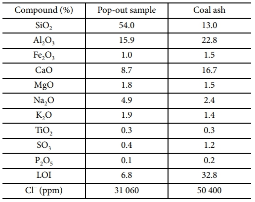 팝아웃 시료와 석탄재의 Wavelength Dispersion X-ray Fluorescence Spectrometer (WD-XRF, ZSX Primus IV, Rigaku, 일본) 분석을 통해 B~Cm 범위의 원소를 분석했으며, 팝아웃 시료의 X-ray Diffraction (XRD, D8 ADVANCE, Bruker Corporation, 미국) 분석을 통해 원소들의 피크를 확인했다. 석탄재를 2.00 kV, 50배율 조건에서 전계방출주사전자현미경(Field emission scanning electron microscope (FE-SEM), GeminiSEM 500, Zeiss, 독일)을 사용하여 촬영했으며, 부착된 Energy dispersive spectroscopy (EDS) 검출기를 통해 석탄재의 구성 원소들을 분석했다. 질소 가스 조건에서 분당 10oC의 속도로 가열 조건에서 TGA (Q50, TA Instruments, 미국) 피크를 분석하여 수화반응을 통한 CaO의 변화를 확인했다. 콘크리트의 압축강도는 ISO 1920-4에 근거하여 0.6 MPa/s의 일정한 속도로 하중을 가하며 측정했으며, 3개의 공시체의 시험결과를 평균하였다.