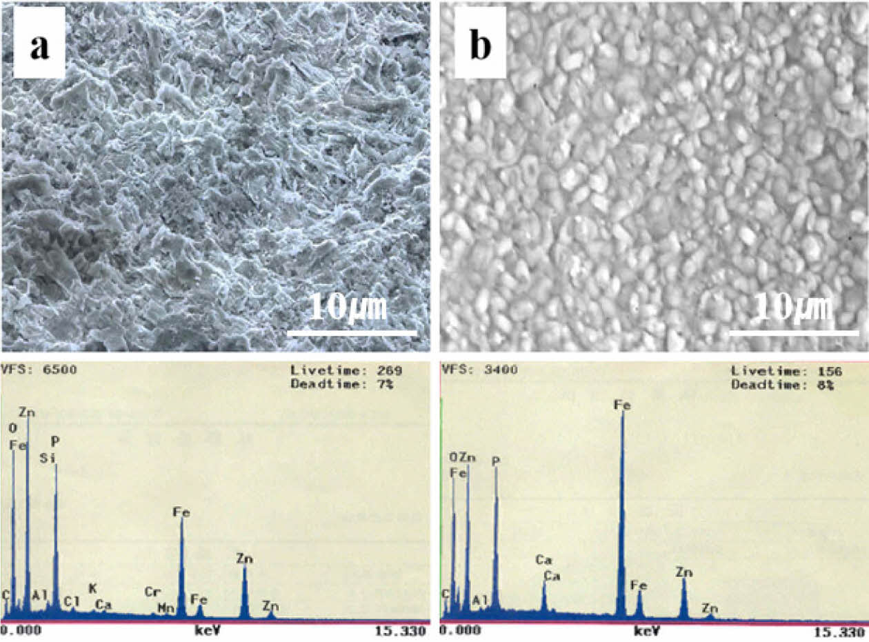 Fig. 1 SEM and EDX results of PE coating after chemical pretreatment process: (a) Ca/Zn=0.15 and (b) Ca/Zn=1.00 |