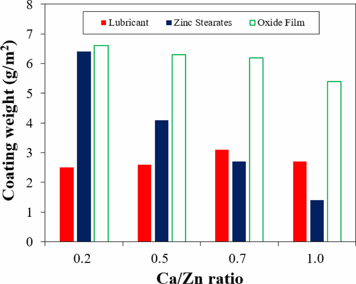 Fig. 2 Meausred coating weights versus Ca/Zn ratios |