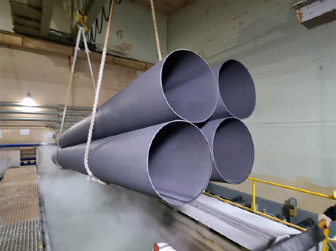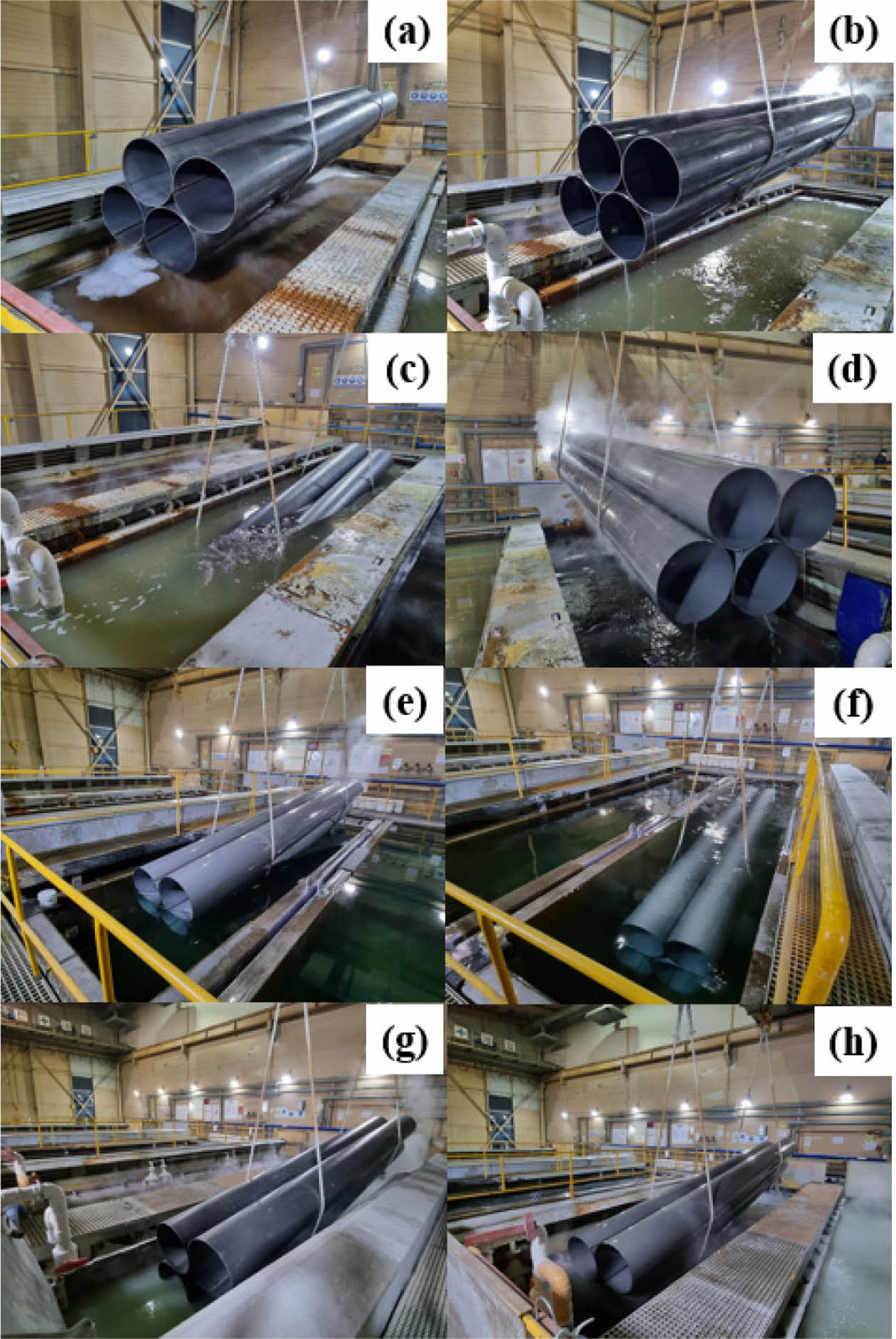Fig. 4(g)의 화성 공정은 인산염을 통해 85oC의 물에서 10분간 진행 후 공정에서 발생한 슬러지 제거를 위해 70oC의 상수에 담가 탕세 공정으로 코팅을 마무리하였다. 코팅이 완료된 화학적 전처리 관을 상온에 12시간 이상 노출시켰고, 녹이 발생하지 않음을 확인함에 따라 화학적 전처리 공정에 대한 검증을 완료하였다(Fig. 5).