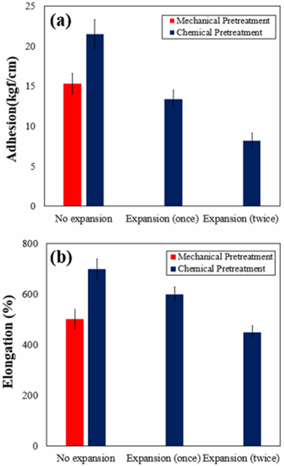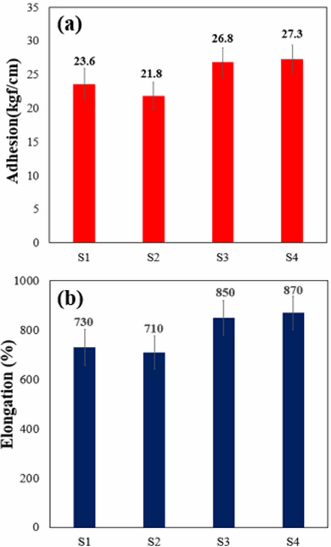 Fig. 8 Measured physical properties of prepared specimens: (a) adhesion and (b) elongation |