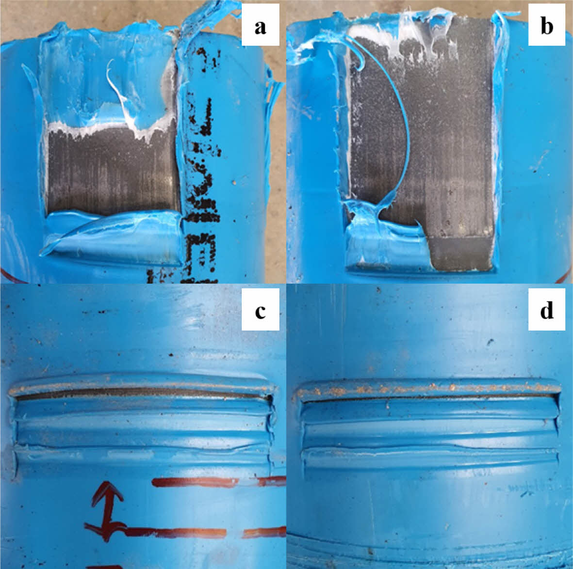 Fig. 12 Specimen after tensile test: (a) control (front), (b) control (rear), (c) newly developed (front), (d) newly developed (rear) |
