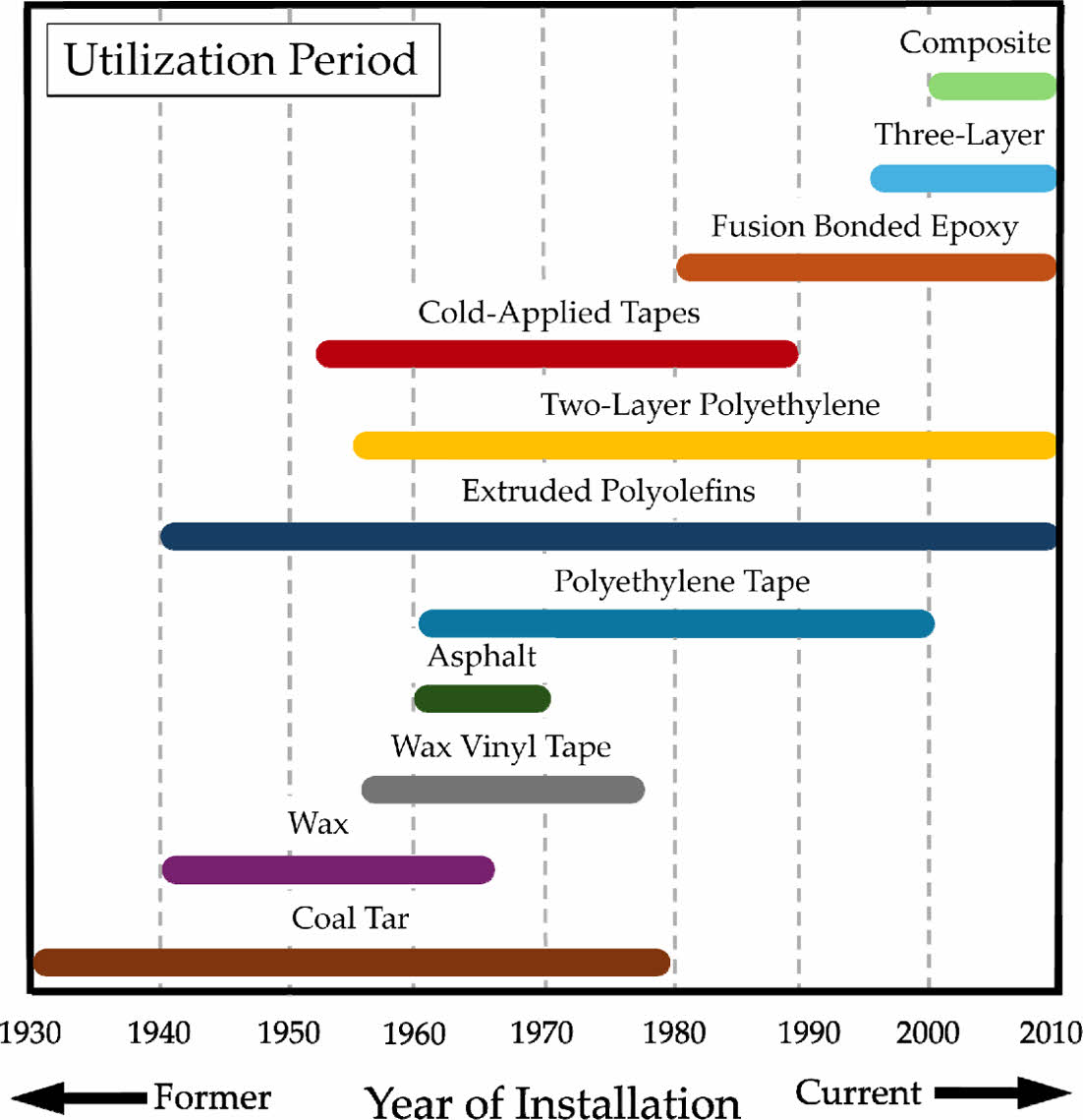 석유, 가스와 같은 에너지 자원의 수송 및 분배 시스템에 사용되는 파이프의 대부분은 강재로 이루어져 있으며 인간의 생활에 필수적인 구조물이다[1]. 강관(steel pipe)의 안정적인 운용을 위해서는 부식을 방지해야 하며 여기서 부식이란 외부 환경 요인에 의해 유발된 화학 반응에 기인한 열화 현상으로, 강관의 내구성능 저하에 영향을 미친다[2,3]. 강관의 적절한 유지관리가 수행되지 않은 경우, 미세 누출(pinhole leakage), 균열(crack), 갈라짐(split), 파열(rupture) 등의 현상이 발생할 수 있다[4]. 또한, 조간대(tidal zone), 비말대(splash zone)와 같은 반복적인 해양 환경은 해양 구조물의 내구성능 및 기대 수명을 만족시키기에 열악한 환경을 조성하기에 강관의 유지관리를 위한 연구가 필수적이다[5]. 표면 코팅 기술은 해양 환경 노출 강관에 적용 가능한 대표적인 방법 중 하나이며 강관과 외부 환경 사이에 물리적 장벽을 형성시켜 부식에 저항하는 보호막 역할을 수행한다[6-8]. 또한, 표면 코팅은 해양 환경에 존재하는 염분과 같은 공격적인 이온이 내부로 전달되는 속도를 감소시켜 열악한 조건에서도 적절한 내식성을 확보한다[9,10]. 이에 연구자들은 강관의 부식방지 목적으로 Wax & Vinyl, coal tar, yellow jacket, polyethylene(PE) tape, three-layer tape & high performance composite coating(HPCC)와 같은 다양한 코팅재료에 관한 연구를 수행하였다[11]. Fig. 1은 코팅기술의 발전 동향을 나타내고 있으며 2000년대부터 복합재를 활용한 코팅과 3중코팅이 사용되기 시작한 것을 확인할 수 있다.